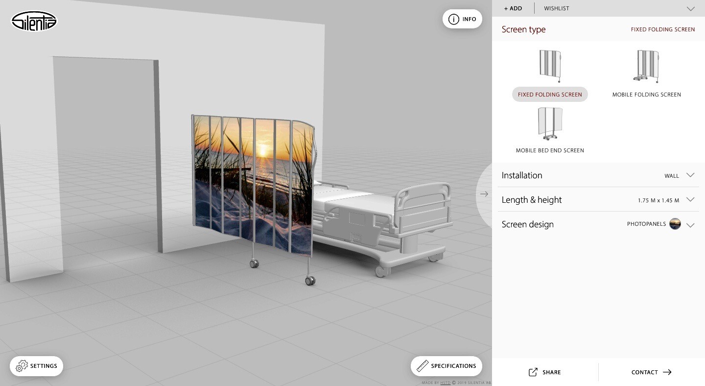Tady si v panelu napravo vyberete typ zástěny, způsob montáže, výšku, délku a design. V levém dolním rohu pak zda bude určena k lůžku, křeslu či do volného prostoru a následně po kliknutí na tlačítko "Specifications" vpravo dole pod vizualizací uvidíte kompletní výslednou konfiguraci zástěny včetně objednacího čísla. Vybranou zástěnu si můžete umístit do seznamu tlačítkem "+ ADD" vpravo nahoře a po výběru všech požadovaných kusů nám je můžete rovnou odeslat emailem pomocí tlačítka "SHARE".